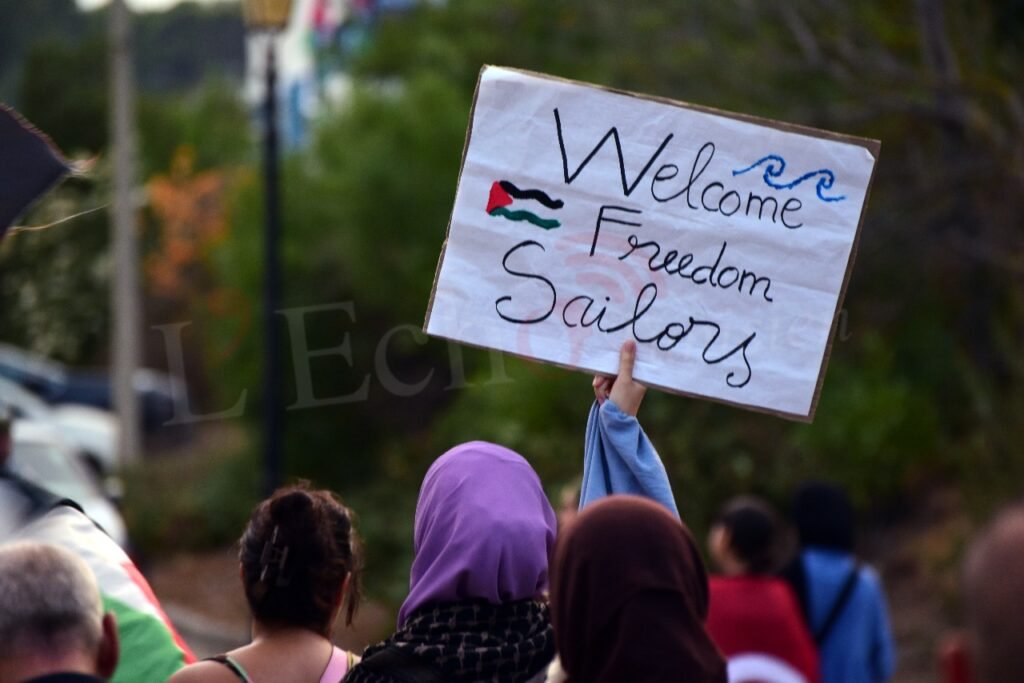 و كان في استقبال الاسطول المئات من التونسيين الذين اكدوا دعمهم اللا محدود للمشاركين في هذه المبادرة كما اكدوا بهتفاتهم على اهمية انهاء هذه الابادة فورا.
