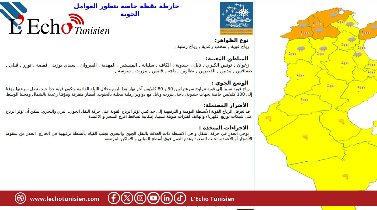 تم إسناد اللون البرتقالي لأربع ولايات وهي جندوبة وباجة وبنزرت ونابل في خارطة اليقظة المؤمنة بالموقع الرسمي للمعهد الوطني للرصد الجوي مما يعني درجة إنذار عالية وضرورة ملازمة الحذر.