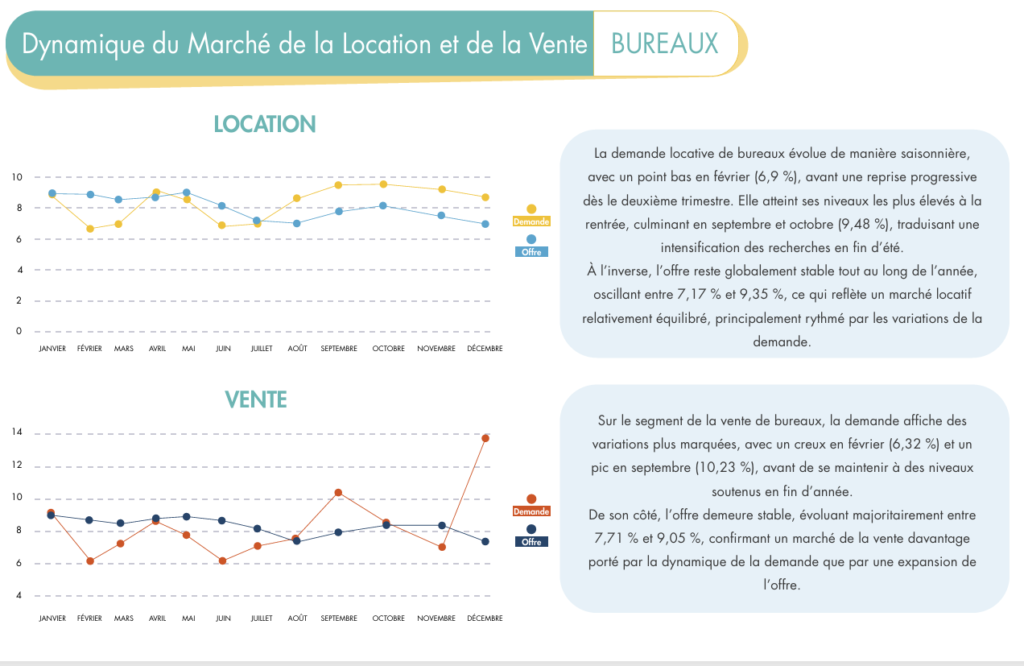 أما في سوق بيع المكاتب، فيُسجّل الطلب تقلبات أكثر حدّة، مع تراجع ملحوظ في فيفري (6.32%) وبلوغ ذروته في سبتمبر (10.23%)، قبل أن يحافظ على مستويات مرتفعة نسبيًا مع نهاية السنة.