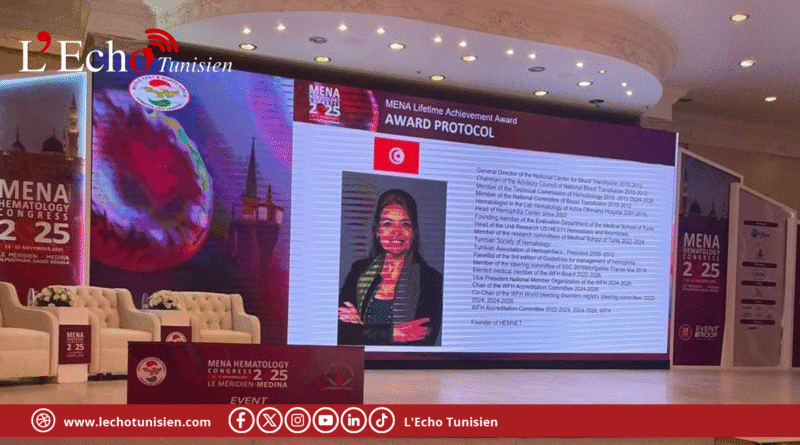 توّجت الأستاذة التونسية المختصة في علم أمراض الدم، آمنة قويدر، بجائزة الانجاز مدى الحياة 2025، وذلك خلال مؤتمر أمراض الدم الملتئم بالمدينة المنورة بالمملكة العربية السعودية من 13 الى 15 نوفمبر 2025.