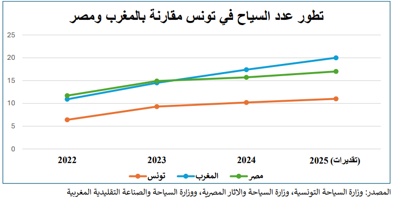وعلى صعيد المنافسة الإقليمية، سجلت بعض الدول أداءً متميزًا، حيث استقبلت المغرب 17.4 مليون سائح، ومصر 15.7 مليون، وتونس 10.2 مليون سائح، وهو الرقم الأعلى منذ عام 2019، مما يعكس قدرة تونس على استعادة نشاطها السياحي بعد تأثيرات الجائحة وتعزيز مكانتها ضمن الأسواق الإقليمية.