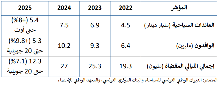 ومع بداية عام 2025، استمر القطاع السياحي في تسجيل أرقام إيجابية خلال فصل الصيف، حيث بلغ عدد الوافدين 5.3 مليون زائر في شهر جويلية ، مرتفعًا بنسبة 9.8% مقارنة بالفترة نفسها من عام 2024، فيما بلغت العائدات السياحية 5.4 مليار دينار، ما يعكس استمرار انتعاش القطاع وتعافي النشاط السياحي في تونس.