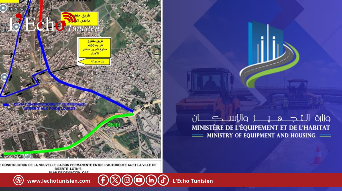 في إطار مواصلة أشغال مشروع الوصلة الدائمة ببنزرت بين الطريق السيارة أ4 ومدينة بنزرت قسط عدد 03، أعلمت وزارة التجهيز والإسكان كافة مستعملي الطريق البلدية بمنطقة بئر مسيوغة أنه في إطار انجاز أشغال المنشأة الفنية على مستوى الناقلة المطاطية لشركة اسمنت ببنزرت سيتم ّتحويل جزئي لحركة المرور.