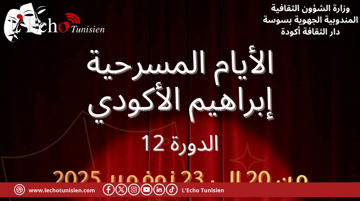 تنطلق مساء الييوم الخميس 20 نوفمبر 2025 دورة جديدة من الأيام المسرحية إبراهيم الأكودي و تتوصل إلى غاية الأحد 23 من نفس الشهر و تتضمن فعاليات هذه التظاهرة الثقافية الفنية المختصة في الفن الرابع عدد من العروض المسرحية حيث تفتح الأيام مسرحية “مستوج” لشركة ماسك للإنتاج الفني وتعرض شركة مسرح غسق بصفاقس يوم الجمعة 21 نوفمبر مسرحية “القاريطة” و يكون عشاق أبو الفنون يوم الست 22 نوفمبر على موعد مع عرض مسرحي بعنوان “بارنويا” لجمعية قربة للمسرح و التنشيط الثقافي و يكون عرض الإختتام مع مسرحية “ثورة الزنج”لجمعية مسرح المغرب العربي بقصر الساف