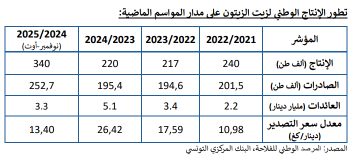 وعلى المستوى الوطني، تألقت تونس بإنتاج قياسي من زيت الزيتون بلغ 340 ألف طن خلال موسم 2024/2025، أي بزيادة تقارب 55% مقارنة بالموسم السابق. ويعزز هذا الإنجاز مكانة تونس كأحد اللاعبين الرئيسيين في السوق العالمية، حيث أصبحت ثالث أكبر منتج عالمي بعد إسبانيا وتركيا، مساهمة بحوالي 10% من الإنتاج العالمي، وفقًا لتقرير المجلس الدولي للزيتون.