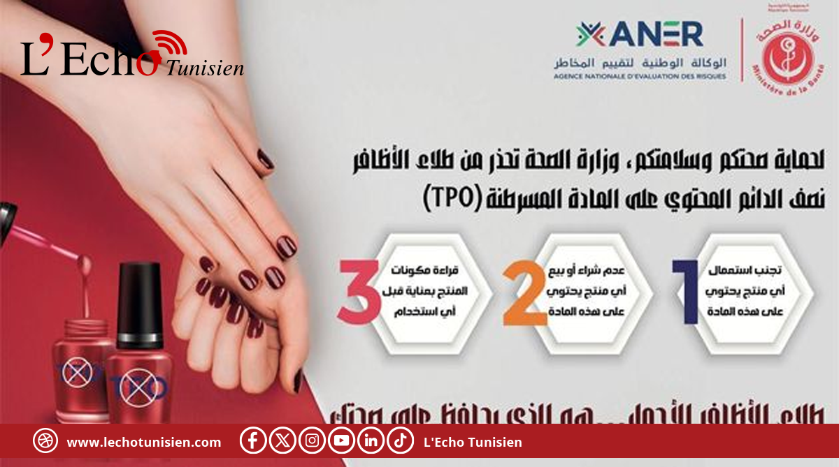 تُعلم وزارة الصحّة أنّه، تبعًا لقرار الاتحاد الأوروبي القاضي بمنع مادة (TPO) Oxyde de diphényl triméthylbenzoyl phosphine) في مستحضرات التجميل نظرًا لما تمثّله من مخاطر صحية باعتبارها مادة سامة ومسرطنة في بعض مستحضرات التجميل وخاصةً طلاء الأظافر نصف الدائم، وذلك لما تُمثّله من مخاطر صحيّة مثبتة، فقد تقرّر ما يلي: