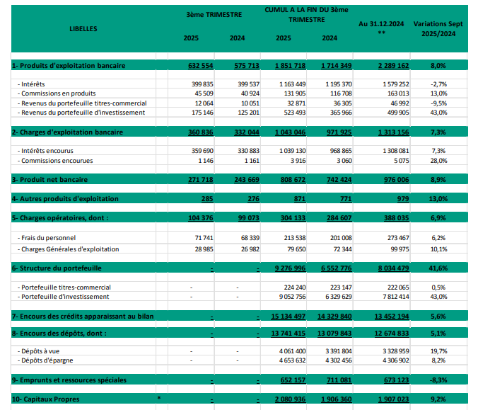 L’activité de la BNA dégage une rentabilité améliorée. Les produits d’exploitation bancaire se sont élevés à 1 852 millions de dinars, en hausse de 8 % par rapport aux 1 714 millions de dinars de septembre 2024.