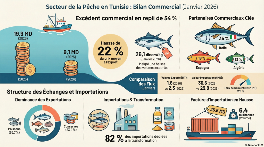 Le secteur des produits de la pêche affiche un excédent commercial de 9,1 millions de dinars (MD) au terme du premier mois de l’année 2026, selon les dernières données publiées par l’Observatoire national de l’agriculture (ONAGRI). Cette performance marque un recul par rapport à la même période de l’année précédente, où l’excédent atteignait 19,9 MD.