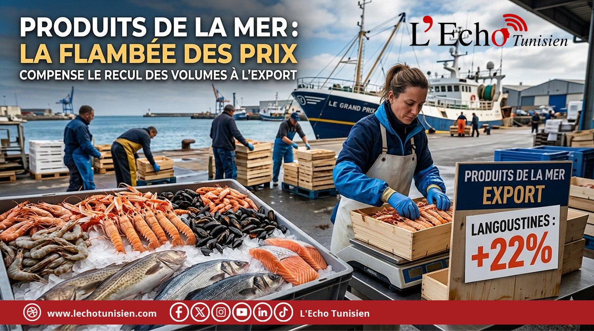 Entre janvier 2025 et janvier 2026, les exportations de produits de la pêche sont passées de 2,3 millitonnes (pour une valeur de 49,7 MD) à 1,8 millitonnes (pour une valeur de 45,7 MD). Cette diminution des volumes exportés a toutefois été accompagnée d’une hausse significative des prix moyens à l’exportation, qui ont progressé de 22 % pour atteindre 26,1 dinars par kilogramme, contre 21,4 dinars un an plus tôt.