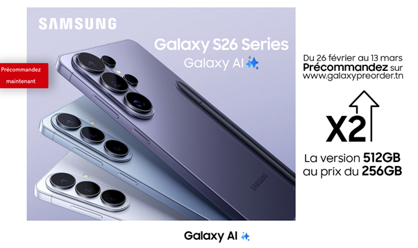 La précommande est ouverte du 26 février au 13 mars exclusivement sur www.galaxypreorder.tn, avec une offre exceptionnelle : les versions 512 GB sont proposées au prix des 256 GB pendant toute la durée de la campagne en plus d’une année entière de garantie offerte sur l’écran. Une opportunité limitée qui permet aux utilisateurs d’accéder à une capacité doublée sans coût supplémentaire.