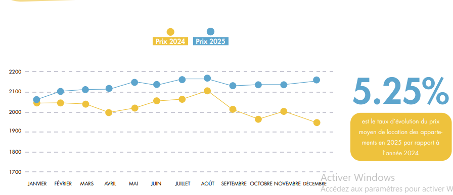 L’année 2025 confirme une tendance haussière sur le marché locatif. Le prix moyen de location s’est situé au-dessus de celui de 2024 sur l’ensemble des mois. L’écart, modéré en début d’année, s’est accentué au second semestre, avec une hausse particulièrement visible en fin d’année. Sur l’ensemble de l’année, l’évolution du prix moyen ressort à +5,25% (2025 vs 2024).