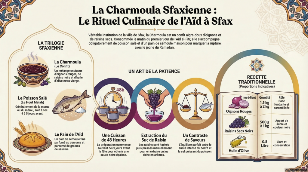 À Sfax, la fin du mois sacré de Ramadan et la célébration de l’Aïd El-Fitr ne sauraient être complètes sans l’odeur caractéristique de la Charmoula. Ce plat, véritable emblème de la cité sudiste, est bien plus qu’une simple recette : c’est une tradition « mythique » et atypique qui rythme le passage vers la fête.