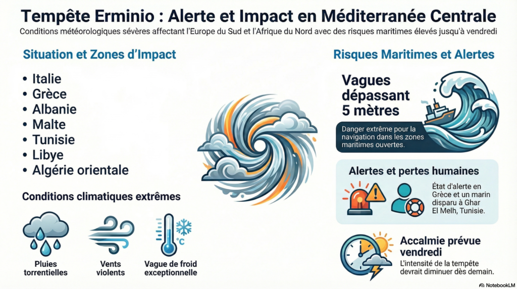 Alors que l’hiver s’installe durablement sur le bassin méditerranéen, une dépression d’une rare intensité a bouleversé les prévisions météorologiques cette semaine. Erminio, cette tempête hivernale ne passe pas inaperçue. Selon l’expert environnemental Hamdi Hached, son épicentre s’est nettement concentré sur le centre de la Méditerranée, affectant prioritairement quatre pays : l’Italie, la Grèce, l’Albanie et Malte. Mais ses franges touchent également les côtes nord-africaines, notamment la Tunisie, la Libye et l’est de l’Algérie, bien que de manière plus relative.
