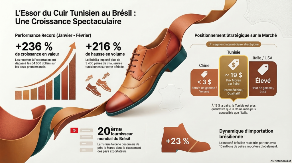 La filière du cuir et de la chaussure en Tunisie vient de signer une performance remarquable sur le marché sud-américain. Selon les dernières données de l’Association brésilienne des industries de la chaussure (Abicalçados), reprises par l’Agence de presse Brésil-Arabe (ANBA), les exportations vers le Brésil ont littéralement bondi au cours des deux premiers mois de l’année.