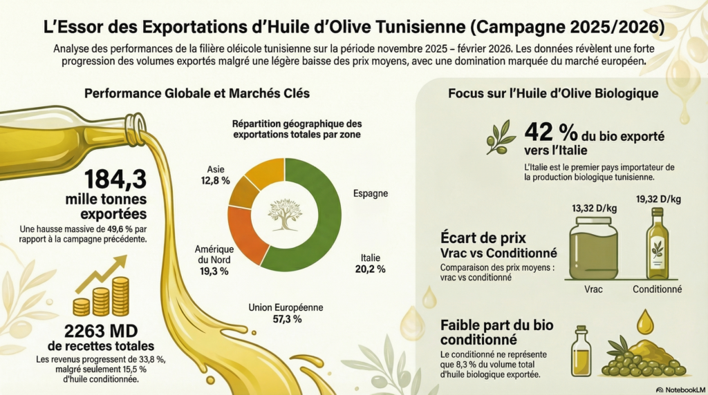Les quatre premiers mois de la campagne 2025-2026 (novembre à février) ont vu les exportations tunisiennes d’huile d’olive franchir un nouveau palier. Selon les données publiées mardi par l’Observatoire national de l’agriculture, les quantités expédiées à l’international sont estimées à 184 300 tonnes, en hausse de 49,6 % par rapport à la même période de la campagne antérieure.