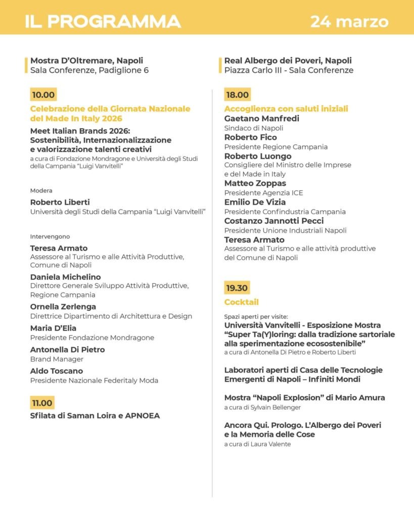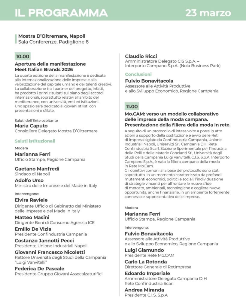 Du 23 au 25 mars 2026, la Mostra d’Oltremare de Naples devient le carrefour stratégique du prêt-à-porter international. Cette 4ème édition de « Meet Italian Brands » (MIT) réunit l’excellence du « Made in Italy » et des décideurs venus de 35 pays, marquant une étape décisive pour l’exportation régionale.
