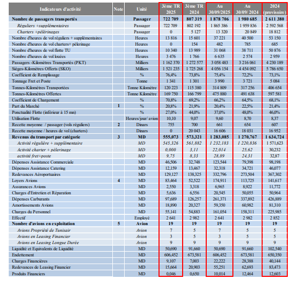 En raison de perturbations dans son programme de maintenance, ayant réduit le nombre d’appareils disponibles, la compagnie a enregistré un recul de 5,1 % du trafic passagers sur la période. Malgré ce contexte difficile, le chiffre d’affaires cumulé sur les neuf premiers mois de l’année s’établit à 1 283 millions de dinars, affichant une légère progression de 1 % par rapport à fin septembre 2024.